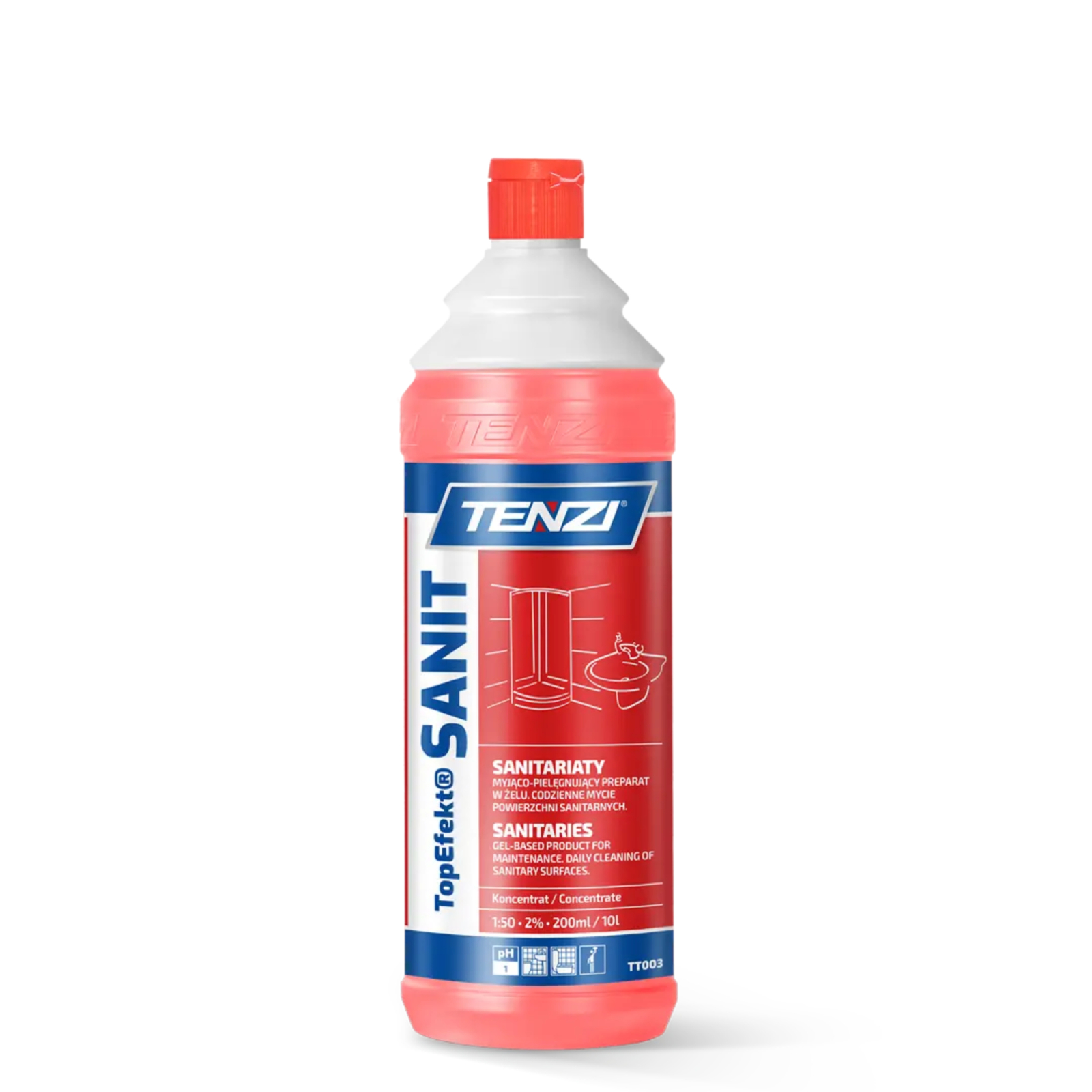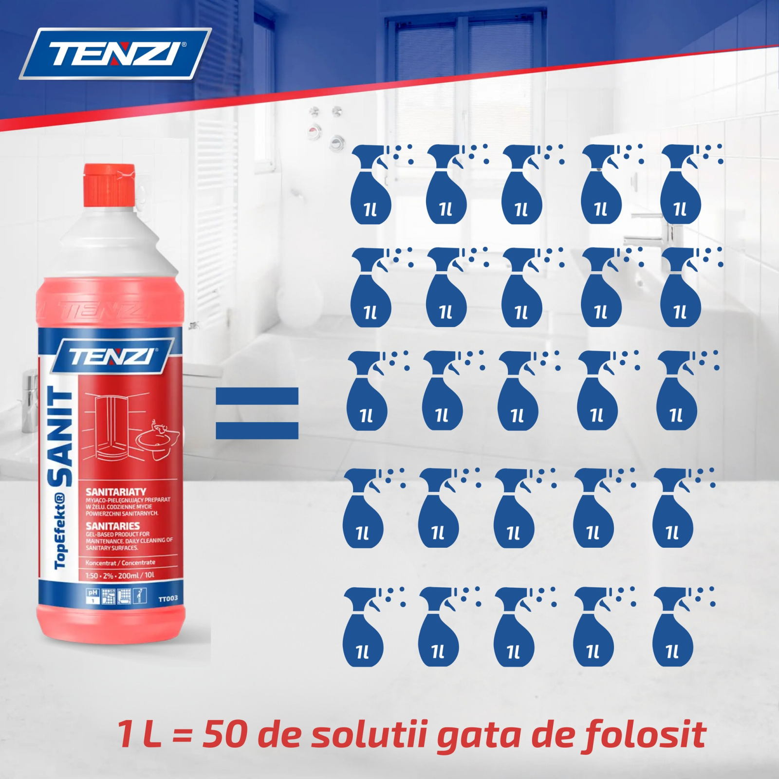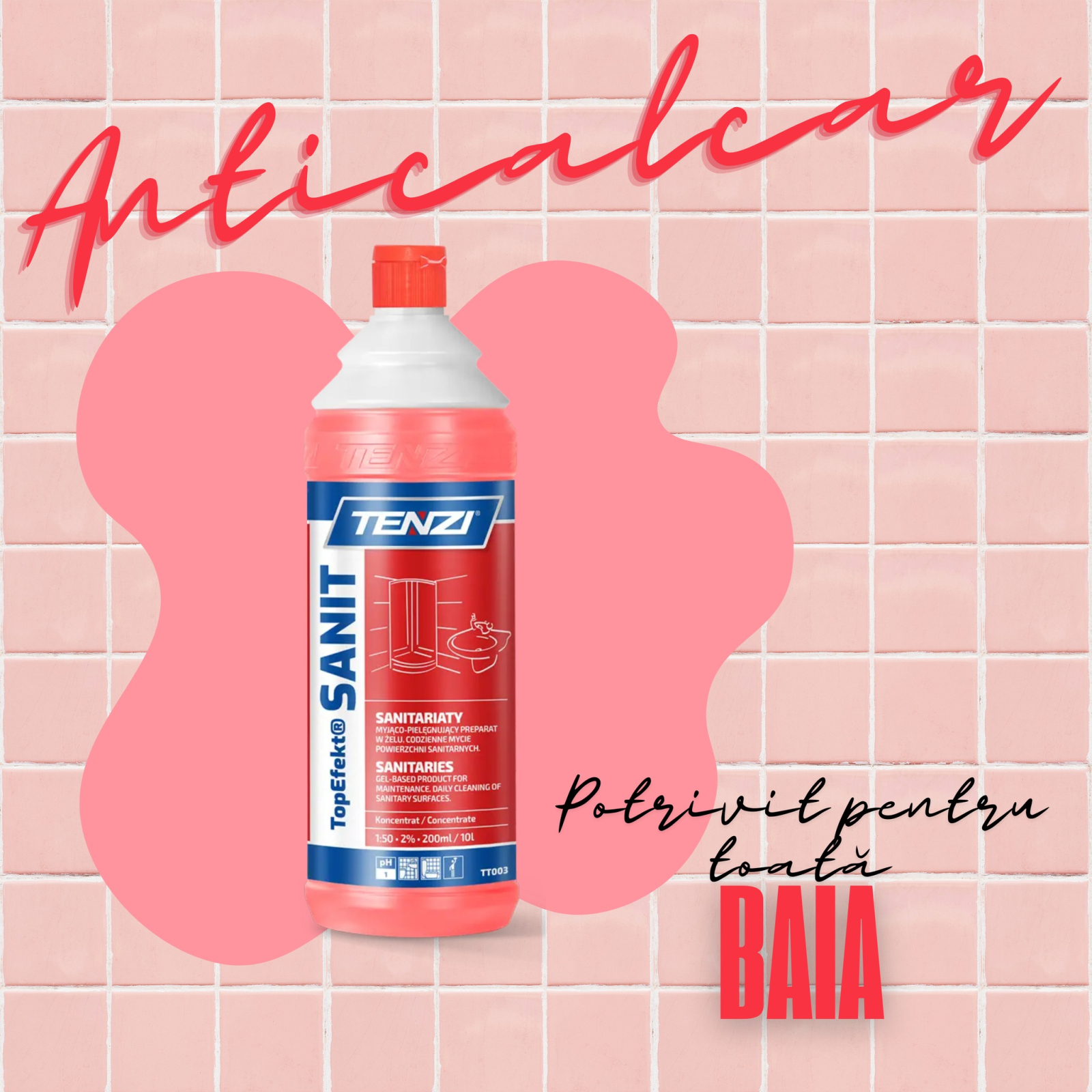 TopEfekt Sanit este un produs acid de curatare delicat, conceput pentru intretinerea zilnica a spatiilor sanitare. Formula pe baza de acid citric actioneaza eficient asupra depunerilor de calcar si a reziduurilor frecvente din baie (pete de sapun, impuritati minerale, murdarie organica), fara sa agreseze suprafetele. Lasa un parfum floral placut, care persista dupa curatare.